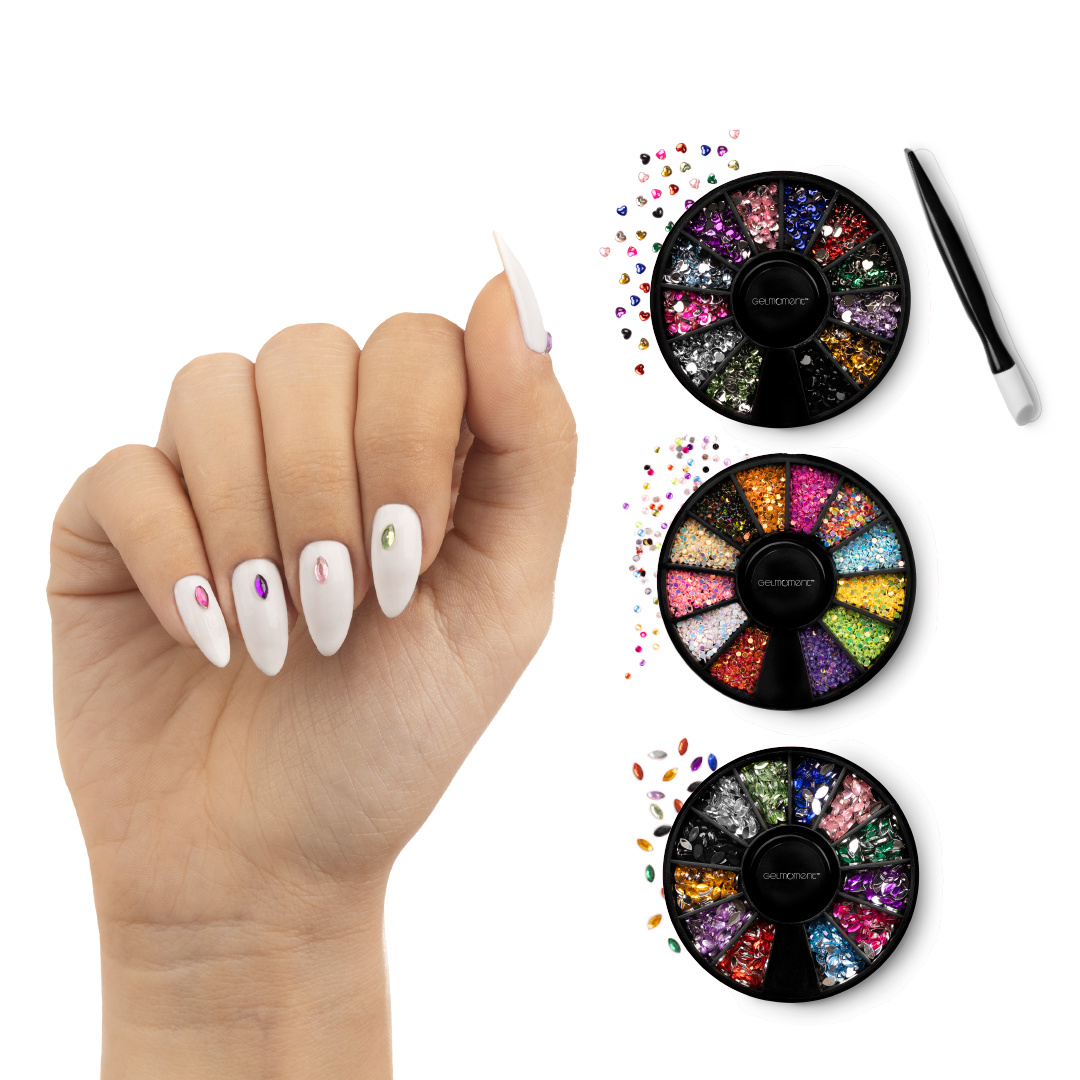 Mini Jewels are an ever-so-charming way to add a sparklingly lavish dimension to your manicure. Each set comes with 12 colours and an applicator stick, bundled together in a GelMoment organza sachet.